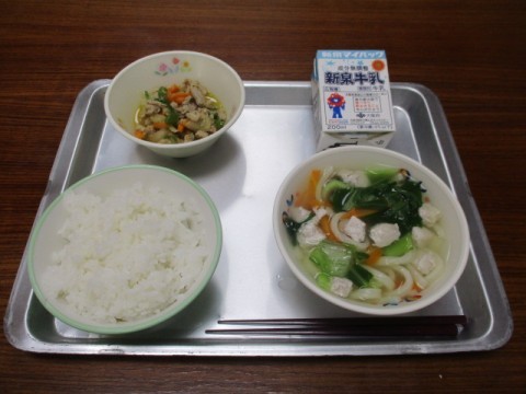 今日の給食のメニューは、ごはん、とりしおうどん、ぶたにくのごまふうみ、ぎゅうにゅう でした。