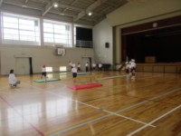 体育館で授業がありました。ふたつのコートに分かれてネットを使っています。