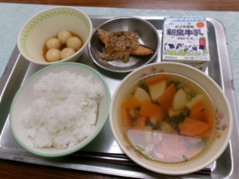 今日の給食は「ごはん・牛乳・つきみ汁・さけのきのこソースかけ・みたらしだんご」です。