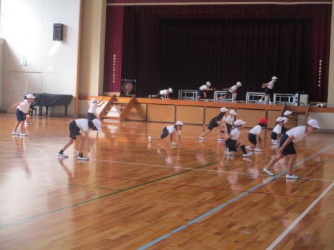 体育館での授業です。準備運動で堺っ子体操をしました。