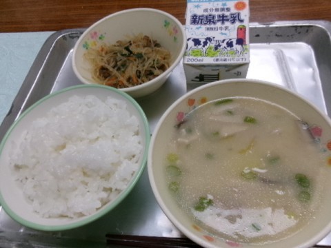 今日の給食は「ごはん・牛乳・チャプチェ・タッカンマリふうスープ」です。タッカンマリは,韓国語で「鶏一羽」という意味です。一羽丸ごとの鶏肉と,じゃがいもなどの野菜を煮込んだ,日本の水炊きのような料理です。
