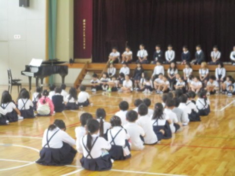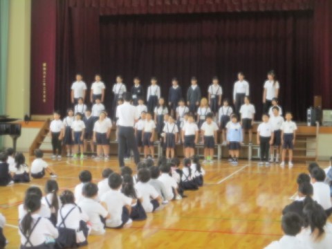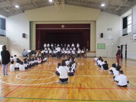 4年生、5年生が連合音楽会の合唱曲をみんなの前で披露しました。