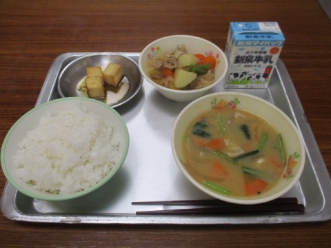 今日の給食のメニューは、ごはん、にくじゃが、あつあげのしょうがやき、ごもくじる、ぎゅうにゅう でした。