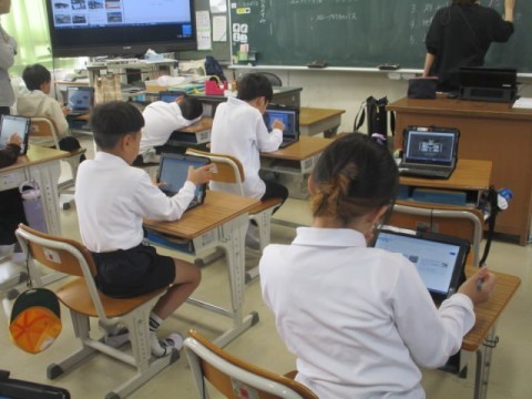タブレットを活用してスロープ付きのバス(自動車)について調べていました。