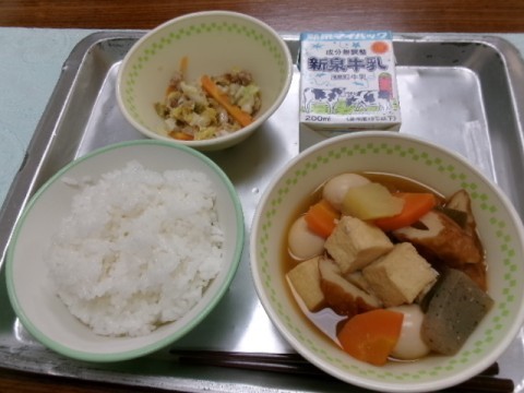 今日の給食は「ごはん・牛乳・はくさいのおひたし・こんぶいりおでん」です。