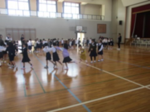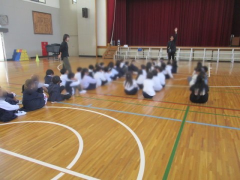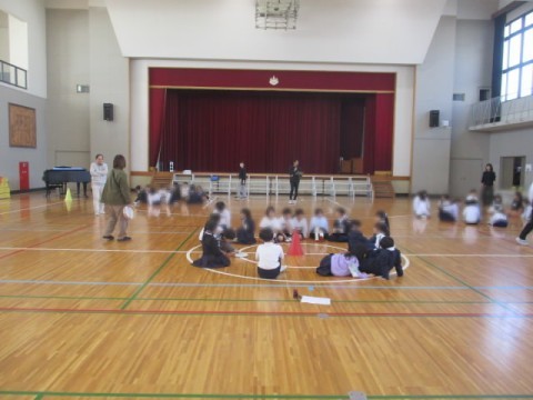 体育館で、少林寺小学校と大仙西小学校の1年生とゲームなどを行いました。