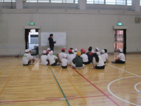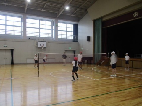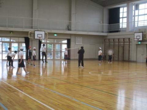 体育館で、バレーボールをしていました。先生からルールの説明がありました。