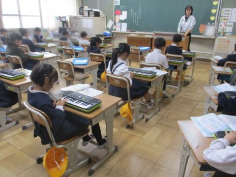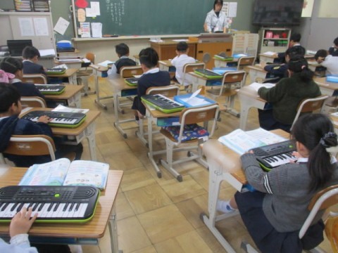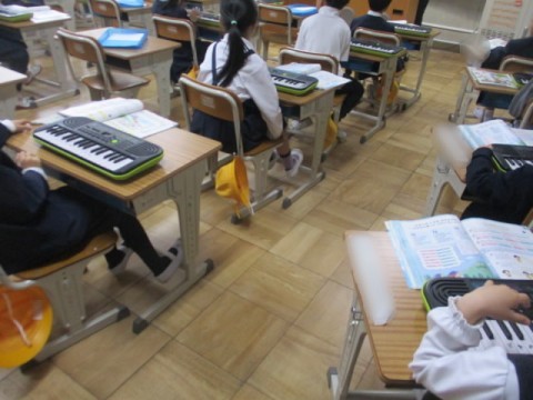 キーボードの練習をしていました。「カエルのうた」を先生の弾くキーボードにあわせて弾きました。