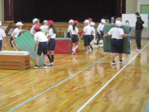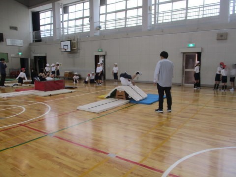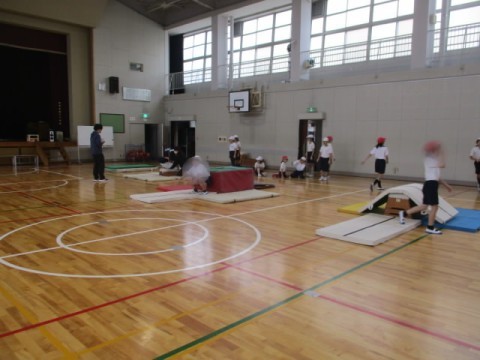 体育館での授業です。跳び箱を練習していました。跳び箱の上で前転する、台上前転をしていました。