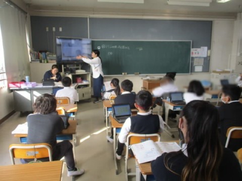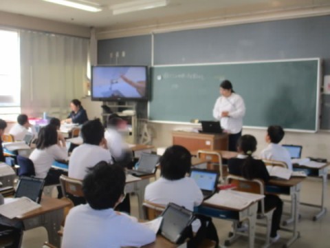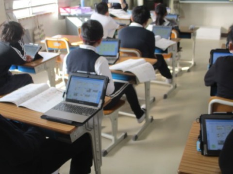 ミシンの使い方について学習しています。モニターの動画や、タブレットの説明を確認して使い方を学んでいます。