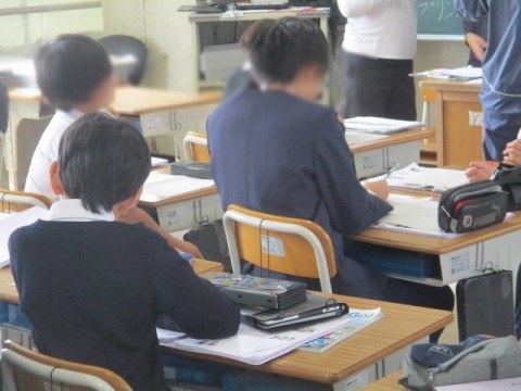 今日は、グループで中学校の先生へ英語で質問する、ビデオの撮影を行っていました。
