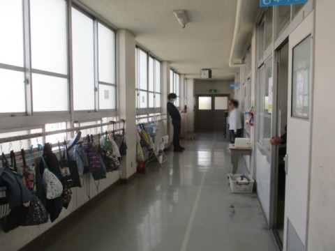教室の中で先生に英語や発音が正しいかを確認していただき、廊下で担任の先生が撮影を行いました。