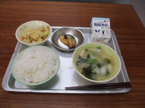 今日の給食のメニューは、ごはん、やきさば、こうやどうふのたまごとじ、みそしる、ぎゅうにゅう でした。