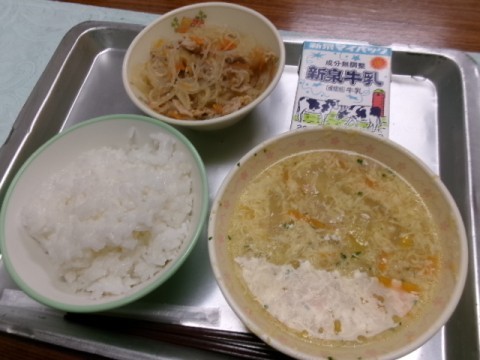 今日の給食は「ごはん・牛乳・マーボーはるさめ・ちゅうかふうたまごとコーンのスープ」です。