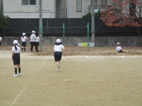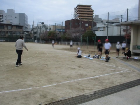 運動場での体育の授業でした。準備運動の後に幅跳びを行いました。