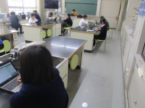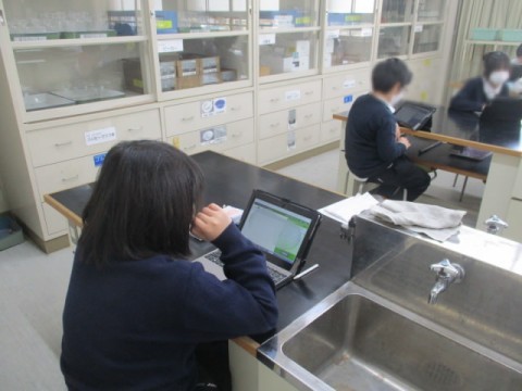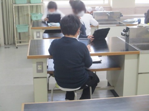 理科室での授業です。テストの後、タブレットを使ってのドリルパークの問題に取り組んでいました。