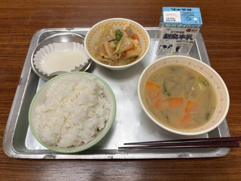 今日の給食のメニューは、ごはん、にくだいこん、さつまじる、ういろう、ぎゅうにゅう です。