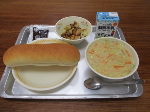 今日の給食のメニューは、コッペパン、クリーミーコーンのとうにゅうスープ、ガーリックポテト、チョコレートクリーム、ぎゅうにゅう でした。