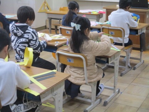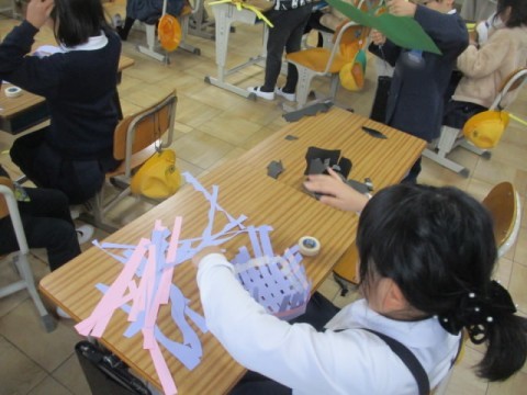 紙をカッターナイフでたくさん切って、その紙を使っていろんなものを作っていました。