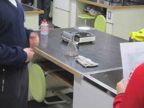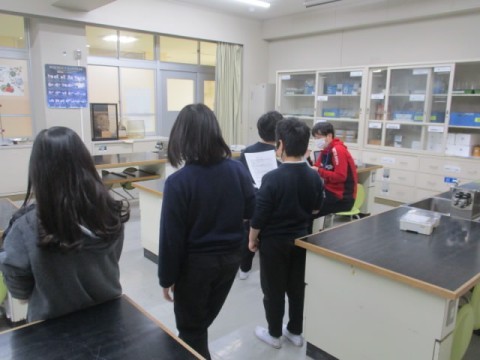 理科室での授業でした。理科の実験の安全チェック表を先生と一緒に確認していました。