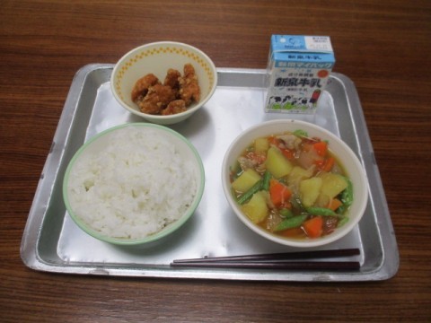 今日の給食のメニューは、ごはん、チキンなんばん、にくじゃが、ぎゅうにゅう でした。