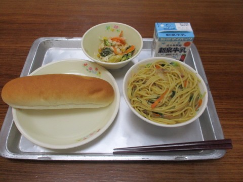 今日の給食のメニューは、ミニコッペパン、じゃことこまつなのスパゲティ、はなやさいのマヨネーズふうみやき、ぎゅうにゅうでした。