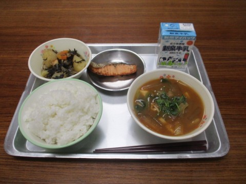 今日の給食のメニューは、ごはん、じゃがいものいそに、やきさけ、あかだし、ぎゅうにゅう でした。