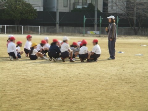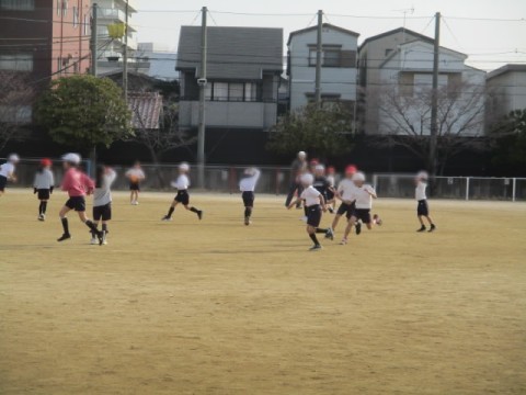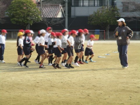 運動場での体育の授業です。準備運動やおにごっこをした後は、トラックを使ってランニングをしていました。