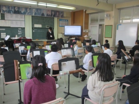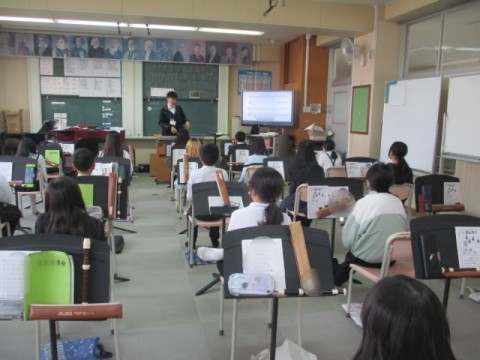 音楽室での授業でした。先生の見本を参考にリコーダーを練習し、その後は発声練習をしました。