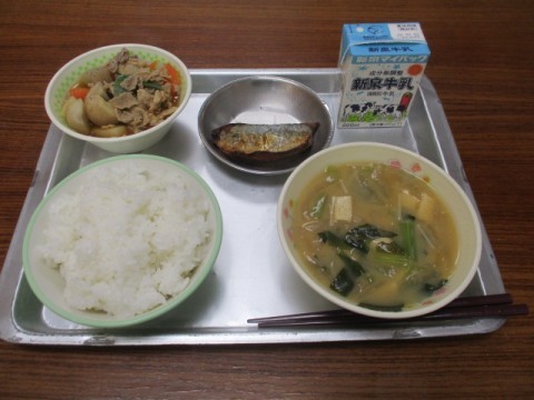 今日の給食のメニューは、ごはん、みそしる、あじのみりんぼし、いもに、ぎゅうにゅう でした。