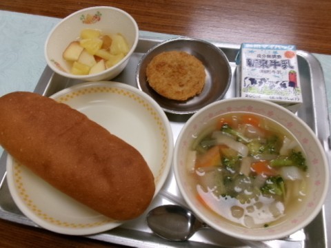 今日の給食 公開日 2026/01/26 更新日 2026/01/26 学校 今日の給食は「コッペパン・牛乳・ふゆやさいスープ・コロッケ・とろりフルーツコンポート」です。りんごは東北地方の青森県でたくさん作られています。りんごに含まれる食物繊維は,おなかの調子を整えてくれる働きがあります。 学校 1年生 2年生 3年生 4年生 5年生 6年生 ひまわり PTA