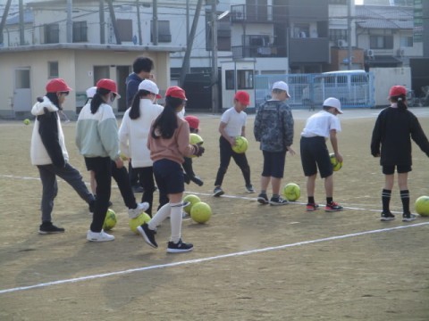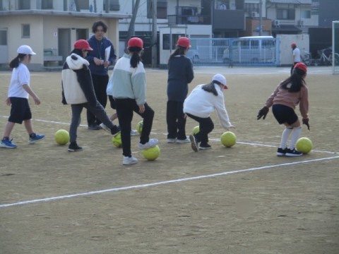 ボールを足で蹴りながら走るのは、なかなか難しいようですが、みんな一生懸命頑張っています。