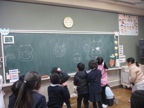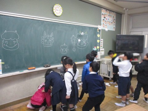 黒板のおにに向かって、「おにはそと、ふくはうち」と元気にみんなでまめまきをしました。