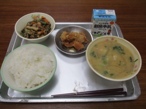 今日の給食のメニューは、ごはん、みそしる、てつぶんたっぷりに、チキンなんばん、ぎゅうにゅう でした。