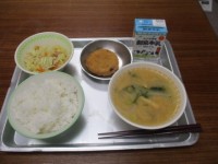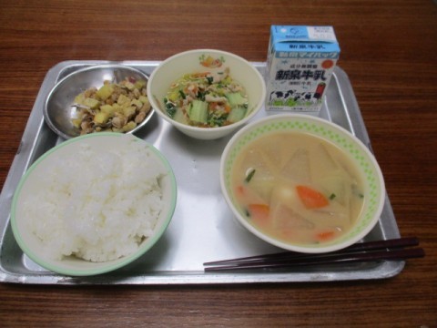 今日の給食のメニューは、ごはん、いなかだんごじる、まめかりんとう、はくさいとしろなのにびたし、ぎゅうにゅう でした。