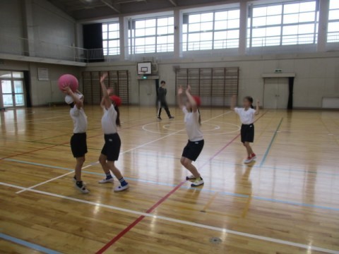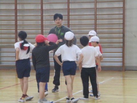 跳び箱にボールがあたると得点になります、チームに分かれて体育館内を走り回っていました。