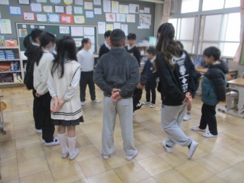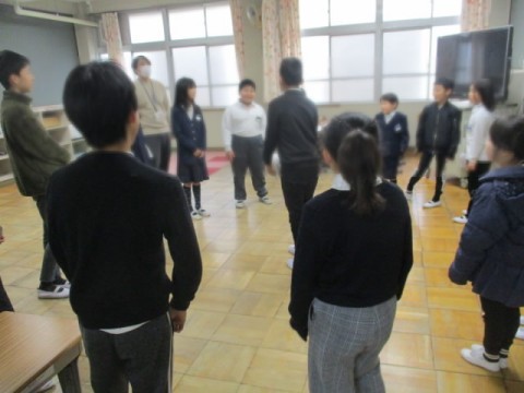 たてわり班にわかれて5年生が中心となり、たてわりゲームを行いました。