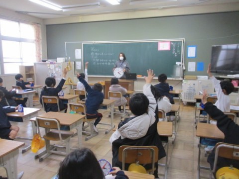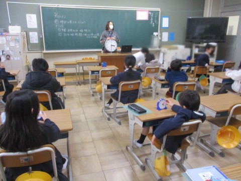 時計の時間から、何分たったら何時何分になるのか、時計のモデルを使って考えました。