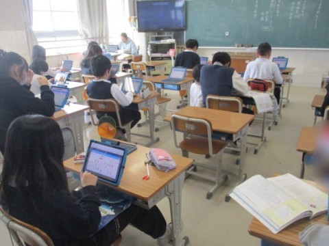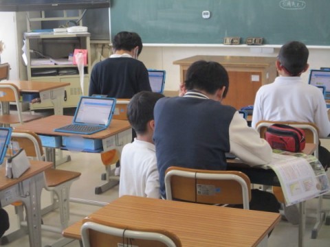 興味のあるテーマを選んで、タブレットなどを使って調べた結果の発表原稿を作成していました。