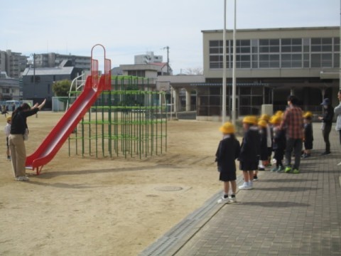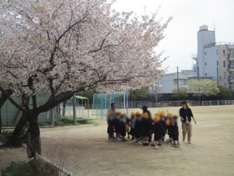 みんなで運動場の探検をしました。校庭の桜の木の下で、みんなで集合写真を撮りました。