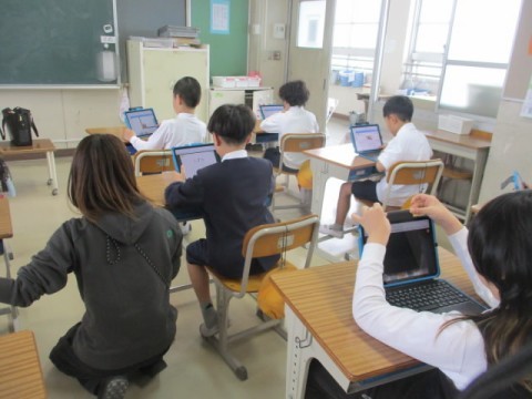 自分の写真を撮り、自分の良いところや目標などをタブレットに入力していました。