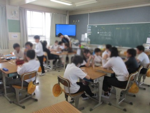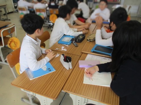 いろんな図形の紙を実際に見ながら、グループに分かれて考えました。