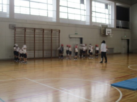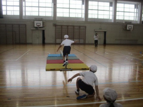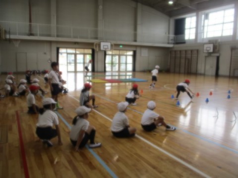 平均台やマット、小さいコーンを使って、体を動かしていました。