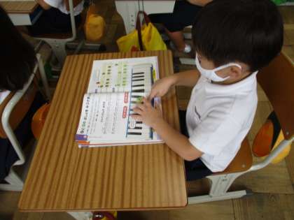 1年生 音楽 公開日 2022/09/06 更新日 2022/09/06 1年生 「どんぐりのおうち」を元気に歌いました。また,これから鍵盤ハーモニカにも取り組むので,歌の中で「ド」と「ソ」がでてきたら,鍵盤の写真の「ド」と「ソ」を押す練習をしました。