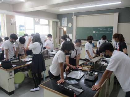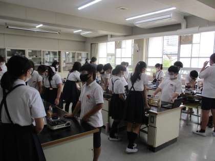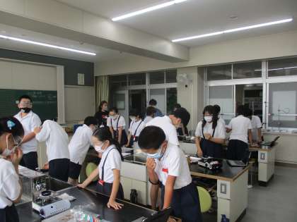理科では「水溶液の性質」の学習を進めていました。今日は「食塩水,ミョウバンの水溶液」をコンロであたためて析出する実験を行っていました。安全眼鏡をつけて,事故のないよう配慮しながら実験を進めていました。一度溶けたものが,再び同じ物質として取り出せるかを仮説を立てながら結果を熱心に観察していました。