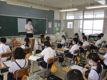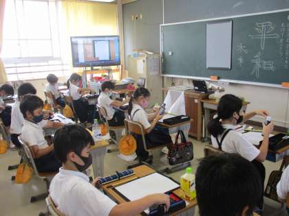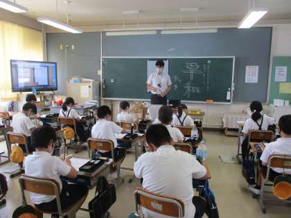 4年生 書写 公開日 2022/09/07 更新日 2022/09/07 4年生 書写では筆を使って「平和」の文字に取り組んでいました。漢字2文字ですが,字の大きさを考えてバランスよく書きていきます。縦,横に筆を運ぶことが多い課題なので,筆を動かす方向や止めるところを意識して,一人ひとり熱心に取り組んでいました。
