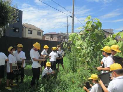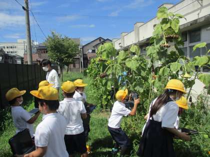 理科では「植物の一生」の学習を進めていました。今日は学習園に行って「ひまわり,マリーゴールド,ほうせんか」の観察を行っていました。花のピークを終え,枯れかけた植物ですが,次の世代を受け継ぐ種を作っていることを確かめていました。一粒の種から多くの種を作って,種を残していく自然の様子を学んでほしいですね。