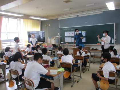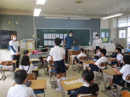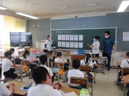 外国語活動では「筆箱の中身を友だち伝えよう」をめあてにして学習を進めていました。NSの先生の問いかけに反応しながら,英語の発音に慣れていました。また,文房具の英語で表現に触れて,自分の英単語の幅を広げていました。