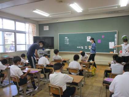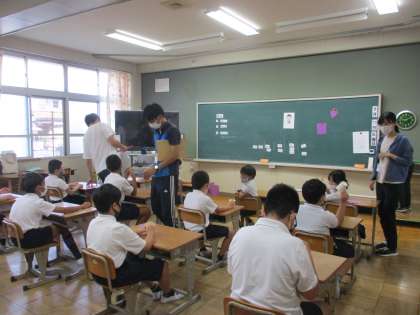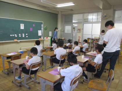 ひまわり学級 朝の会 公開日 2022/09/13 更新日 2022/09/13 ひまわり学級 朝の会では「9月の掲示」づくりを行っていました。ブドウの掲示物を作るために紙コップの底を使って円をあがいていました。円をたくさん描いてブドウの房を表現していました。おいしそうなブドウが描けたでしょうか?
