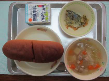 今日の給食は「あじの香草チーズ焼き,スープ煮,黒糖パン」でした。黒糖パンには,黒糖という砂糖が使われています。黒糖は黒い色なので,焼きあがった黒糖パンも色が黒くなります。ほんのりと黒糖の香りもします。